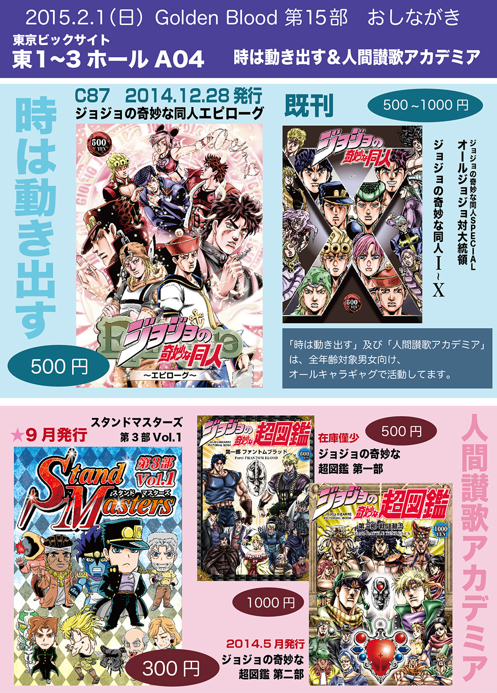 冬コミも落選でしたが、「ジョジョの奇妙な超図鑑」シリーズを出している「人間讃歌アカデミア」さんに全種おいていただくことになりました。
